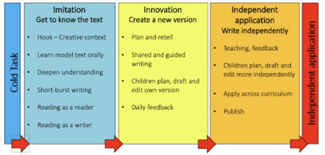 The key stages of the Talk for Writing process enable children to imitate orally the language they need for a particular topic, before reading and analysing it, and then writing their own version.